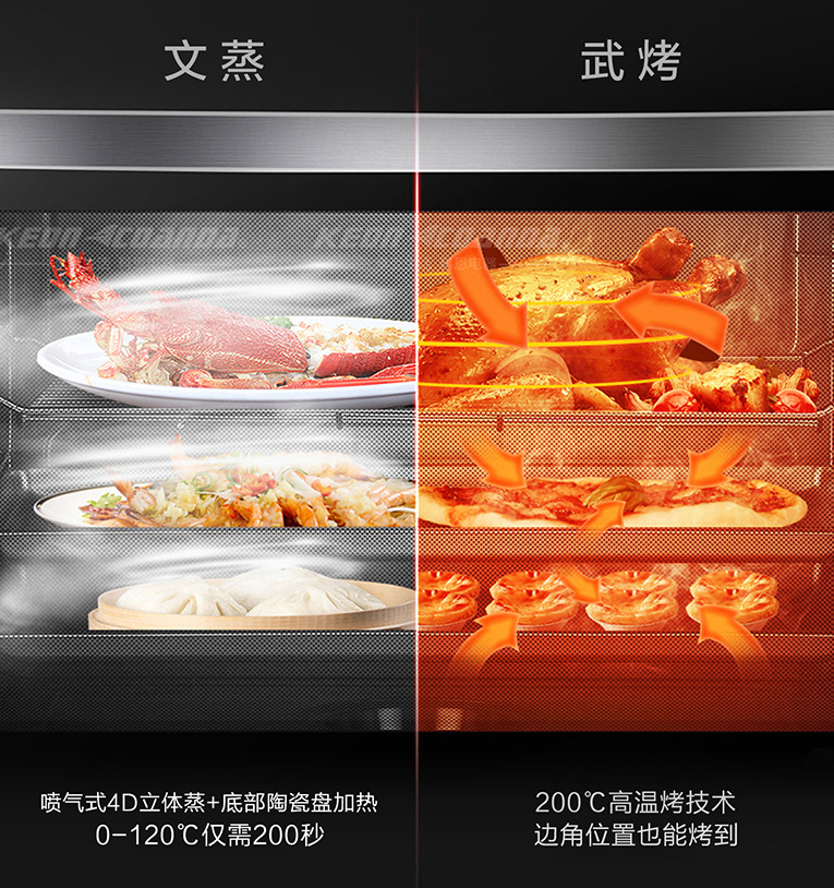 在烹飪方面,科恩智能蒸烤消一體集成灶搭載62L黃金容量蒸烤箱,純蒸、高溫蒸、嫩烤、熱風烤等多種烹飪模式選擇,廣域控溫,4D立體直噴蒸烤模式設計,使蒸箱加熱速度一提再提,四面受熱更均勻,熱風對流立體烘烤色香味俱全,能夠全面喚醒食材鮮美營養并色澤更亮麗!5.0KW大火力設計,能夠肆意爆炒,美味快速出鍋,熱量集中不分散,鑄鐵鍋架帶雙聚能環設計,使熱效率更高,59銅火蓋,耐高溫,導熱性更強,使用壽命更長,全面優于他牌同類產品!