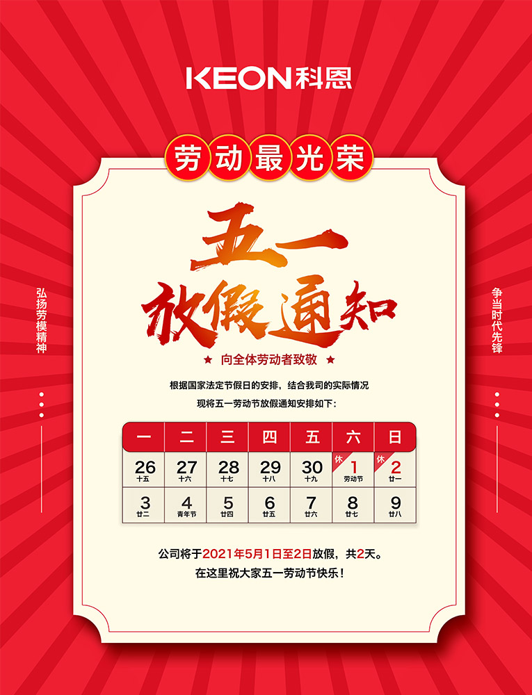 2021年度五一國際勞動節將至,在此首先向科恩電器分布于全國各地的經銷商合作伙伴致以最誠摯的祝福與感謝!同時,公司結合2021年生產進度、運營規劃、現將五一放假安排通知如下: