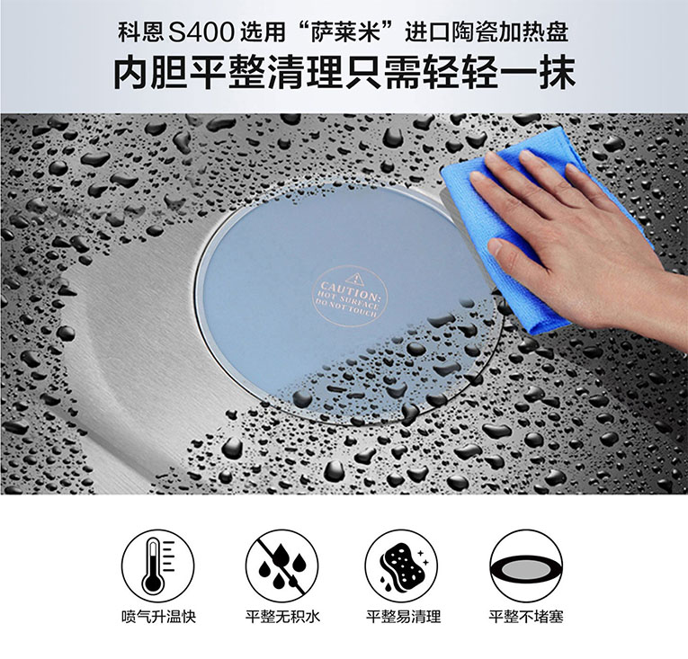 集成灶十大品牌、廚電行業十大品牌科恩S400蒸烤消一體集成灶擁有73L大容量空間,與傳統腔體不同,S400蒸烤箱頂部采用微晶玻璃加熱,有效杜絕冷凝水,解決蒸烤時油脂滴落對食物造成的影響;另外蒸烤箱還擁有雙蒸汽孔設計,快速出蒸汽包裹食材,蒸出美味蒸出鮮;S400底部采用進口“薩萊米”陶瓷加熱盤,跟傳統煮盤相比不僅打理更便捷,還能杜絕堵塞、千滾水的產生。