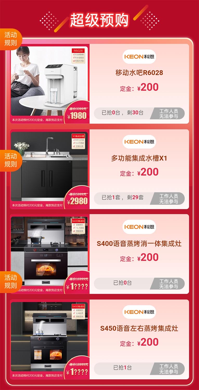 本次超大力度的科恩蒸烤節活動獲得了消費者廣泛的參與和關注,爆款產品加入套餐,助力線下終端門店銷量騰飛。9.9元特權卡,限量搶購,購物更省錢,預付9.9元就能抵用金額200元(無門檻),特權一:享受到當地科恩門店200元抵扣(特價機型除外)、特權二:享受全國科恩門店實時優惠、特權三:保價全年買貴退差價;