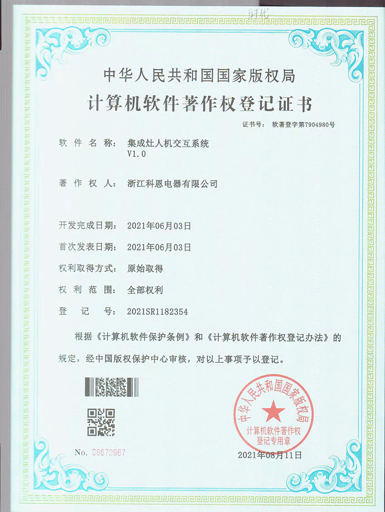 近日,由浙江科恩電器有限公司完全自主研發(fā)的集成灶人機交互系統(tǒng)V1.0軟件正式獲得國家版權(quán)局頒發(fā)的計算機軟件著作權(quán)登記證書。計算機軟件著作權(quán)是企業(yè)核心自主知識產(chǎn)權(quán),是企業(yè)的“無形資產(chǎn)”,是企業(yè)科技的生命力和價值所在。同時,國家權(quán)威部門的認(rèn)證將使搭載這些軟件的產(chǎn)品價值倍增。此次集成灶十大品牌、廚電行業(yè)十大品牌科恩集成灶獲得計算機軟件著作權(quán),充分展現(xiàn)了企業(yè)強大的研發(fā)實力和核心競爭力。