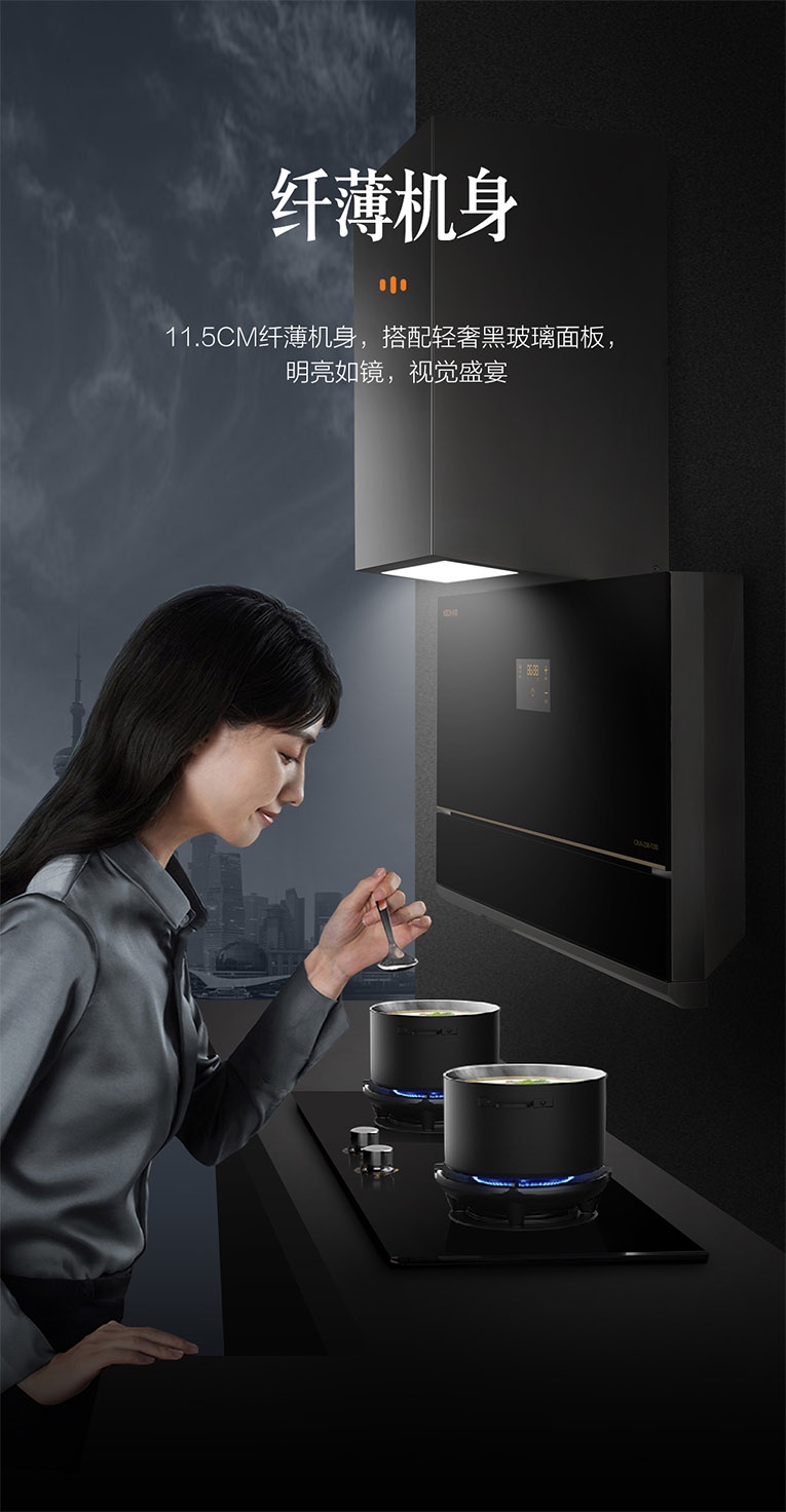 廚房環(huán)境要將就?絕不同意!高顏值的廚房離不開高性能的廚電搭配,集成灶十大品牌、廚電行業(yè)十大品牌科恩新一代大吸力煙機7350,大吸力,不跑煙!整機采用輕奢黑晶玻璃面板,11.5cm纖薄機身,搭配大寬屏柔光照明,烹飪視野更加開闊,無需低頭就能分辨調(diào)味料,盡情享受廚房的聚光燈。