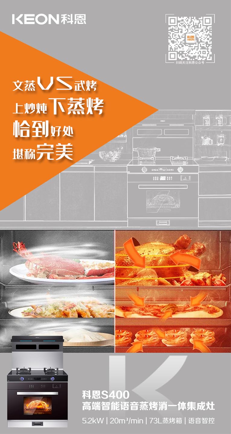 今天,給大家推薦一臺(tái)專(zhuān)治“懶人綜合癥”的集成灶,集成灶十大品牌、廚電行業(yè)十大品牌科恩S400變頻大吸力蒸烤消一體集成灶,上爆炒,下蒸烤,普蒸、強(qiáng)蒸、嫩烤、風(fēng)烤等各種模式一應(yīng)俱全,三分手藝,七分火候,蒸烤烹炸,美食的靈魂與火候區(qū)分不開(kāi),文火均勻,大火猛烈,多種火力調(diào)節(jié)讓廚房小白們也能輕松搞定美食,蒸烤箱只需將食材準(zhǔn)備好放進(jìn)蒸烤箱,選好模式以及對(duì)應(yīng)的溫度、時(shí)間,美食就能信手拈來(lái)。