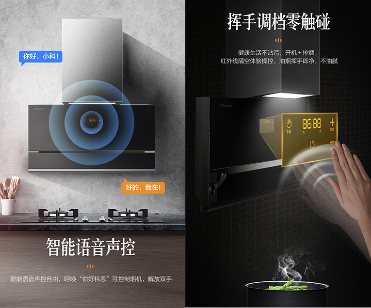 另外,科恩新一代7350變頻大吸力煙機(jī)擁有智能語音+揮手操控功能,智能語音聲控自由,呼喚“你好小科”可控制煙機(jī),揮手調(diào)檔,紅外線隔空體驗(yàn)操控,開機(jī)+排煙,揮手即凈,不油膩,同時(shí)還搭載60S延時(shí)關(guān)機(jī)功能,吸盡熱鍋余煙,人離也能凈油煙。
