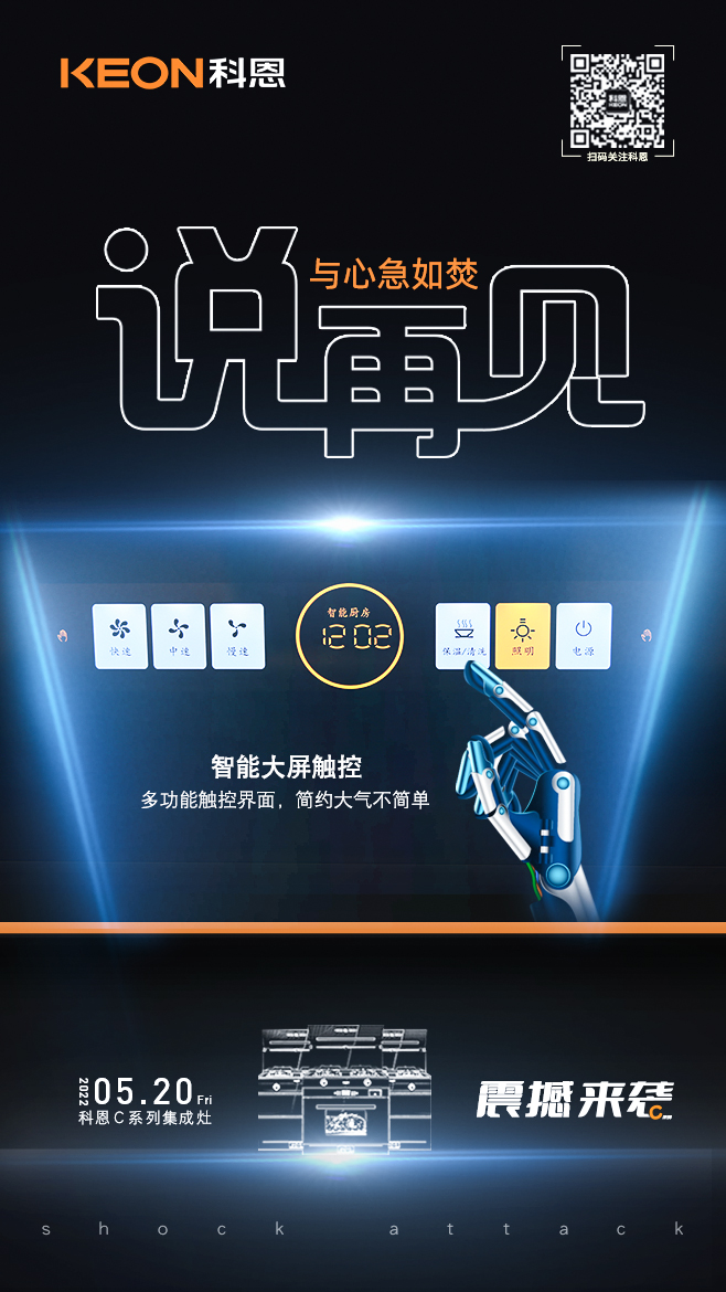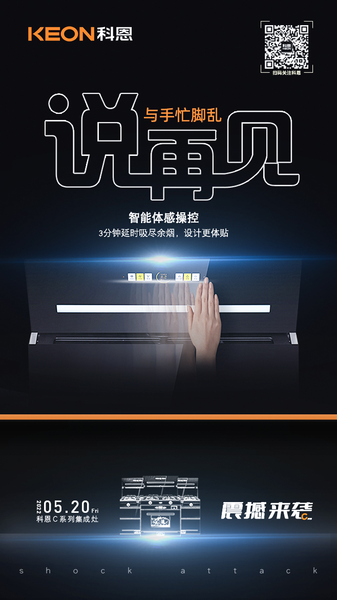 K型機頭時尚設計,KING金牌品質,強力攏吸,油煙難逃,超跑格柵進煙口,靈感來自于寶馬經典格柵車頭,有顏更有料。可拆卸特氟龍進煙口,易打理不生銹,一擦即凈,精致下廚不花妝,與蓬頭垢面的自己說再見!總有那么幾次等到油煙四起才想起沒有打開煙機,急忙去按開關,手指的油漬又沾染在了機身上,實在難受!科恩C系列集成灶擁有智能體感操控,輕輕揮手就能輕松實現無接觸操作,三檔風速調節,迸發強勁動力,風隨手動,與手忙腳亂的自己說再見!