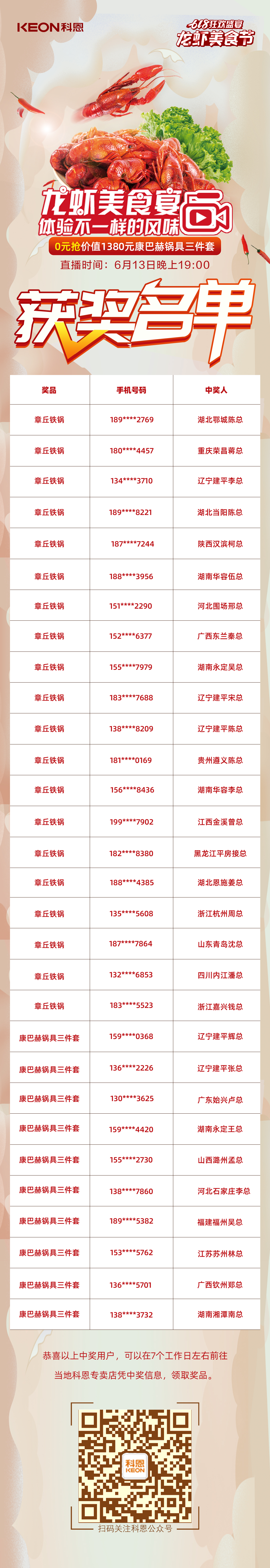 為回饋消費(fèi)者的支持與厚愛,科恩集成灶實(shí)力寵粉,不僅推出線下龍蝦美食宴活動,更有多輪線上大抽獎活動。這么精彩的龍蝦美食節(jié)直播活動,你參與了嗎?1元薅羊毛的機(jī)會你搶到了嗎?快來看看這期中獎名單,有你嗎?