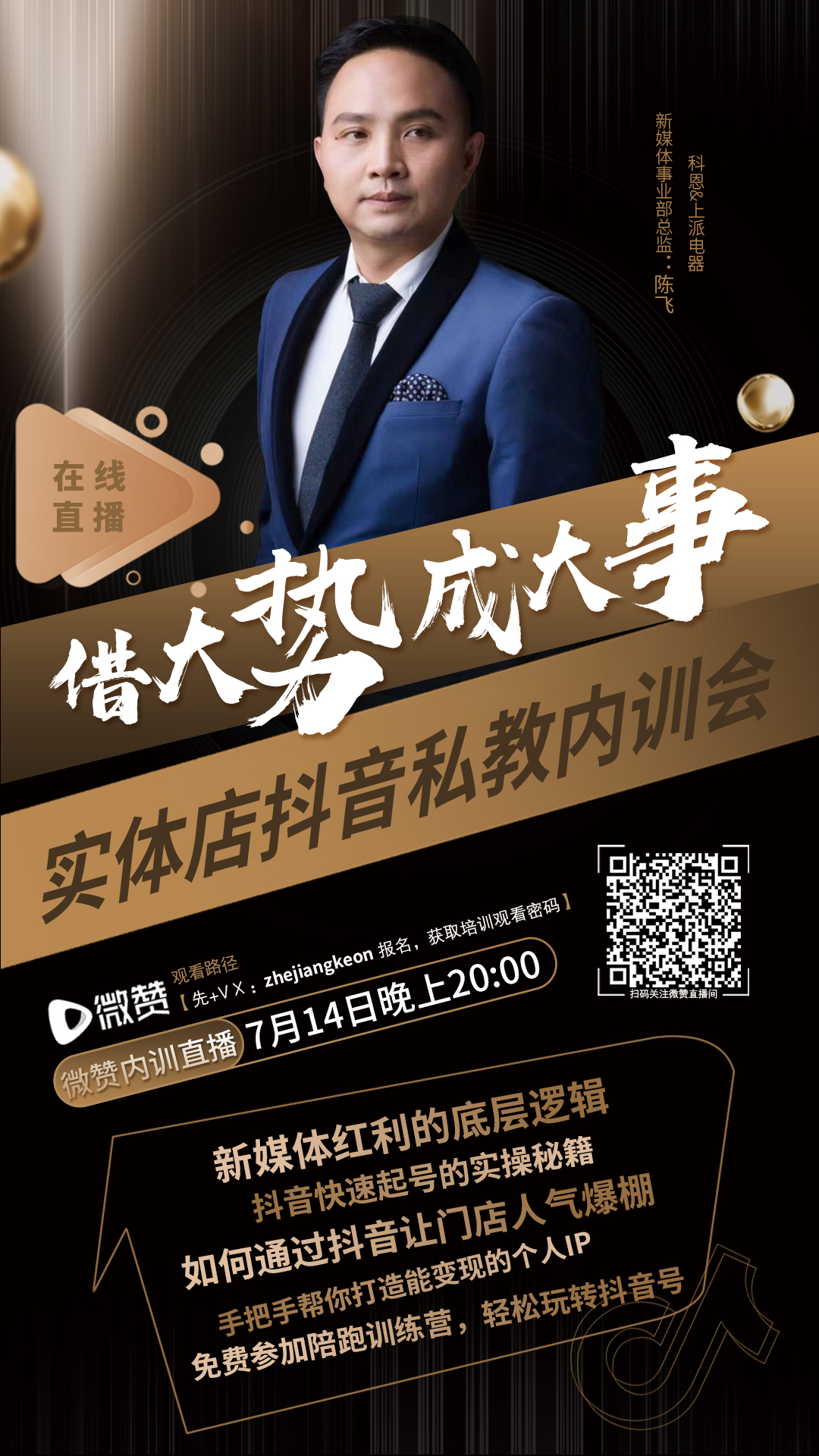 培訓(xùn)時間:7月14日晚上8點,適合人群:實體店老板,你將得到:新媒體紅利的底層邏輯、抖音快速起號的實操秘籍、如何通過抖音讓門店人氣爆棚、手把手幫你打造能變現(xiàn)的個人IP、免費參加陪跑訓(xùn)練營,輕松玩轉(zhuǎn)抖音號!分享人:  抖音流量運營特級講師、科恩&上派新媒體事業(yè)部總監(jiān),觀看路徑:微信號zhejiangkeon報名,獲得免費內(nèi)訓(xùn)資格!