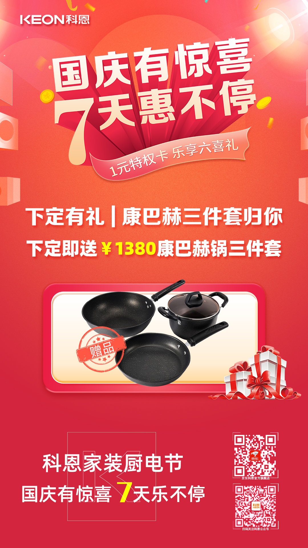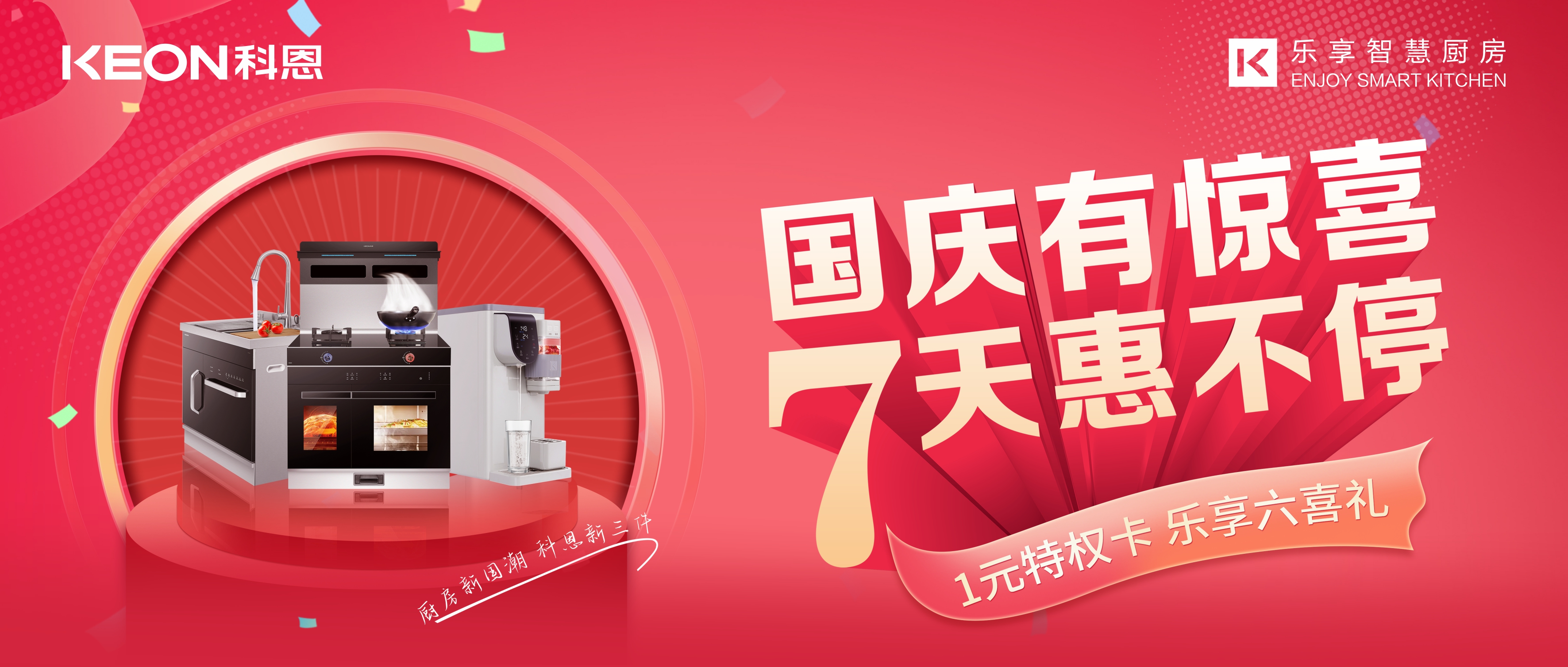 國慶價·提前享,科恩家裝廚電節之國慶專輯——國慶有驚喜,7天惠不停,科恩集成灶帶你嗨購黃金周!