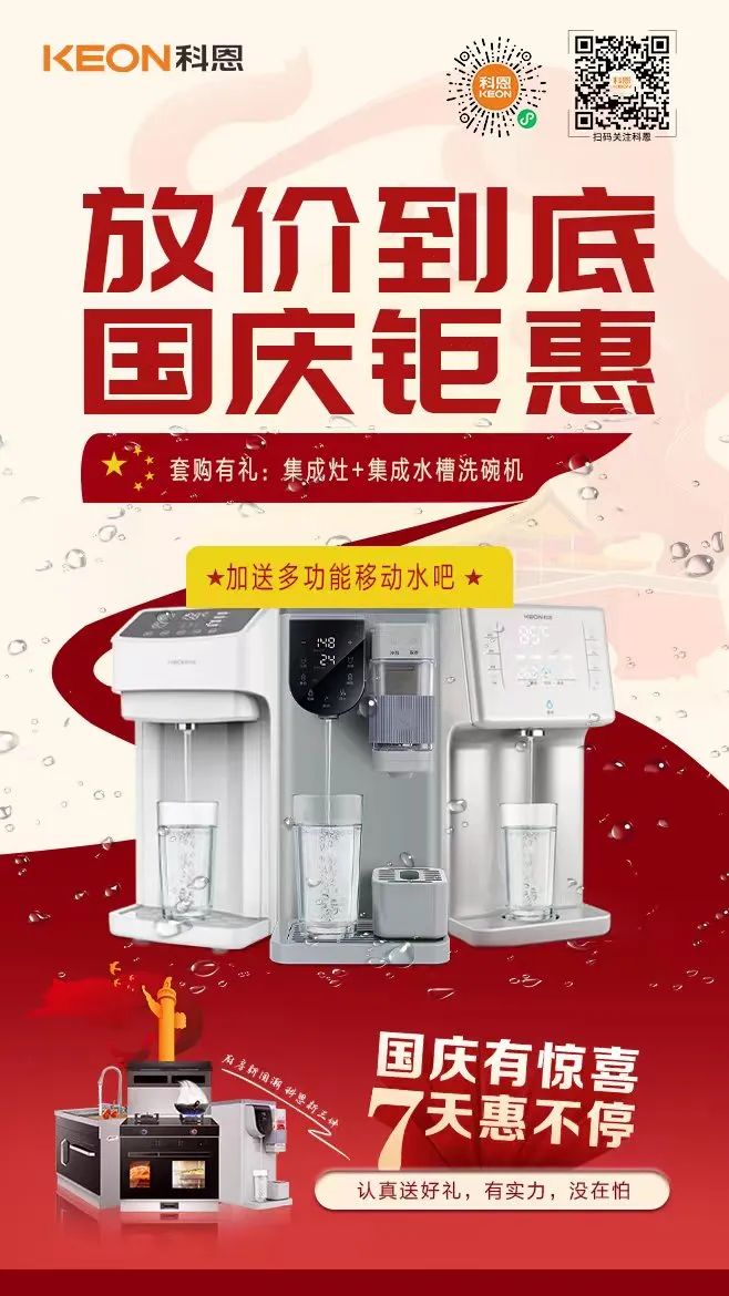 金九銀十家裝季,最怕就是挑不完的廚電,逛不完的商店,科恩懂你所想,趁著國慶鉅惠,放價到底:活動期間,凡在門店購買集成灶+集成水槽洗碗機套餐用戶加送科恩多功能移動水吧一臺!科恩集成灶,認真送好禮,有實力,沒在怕的!