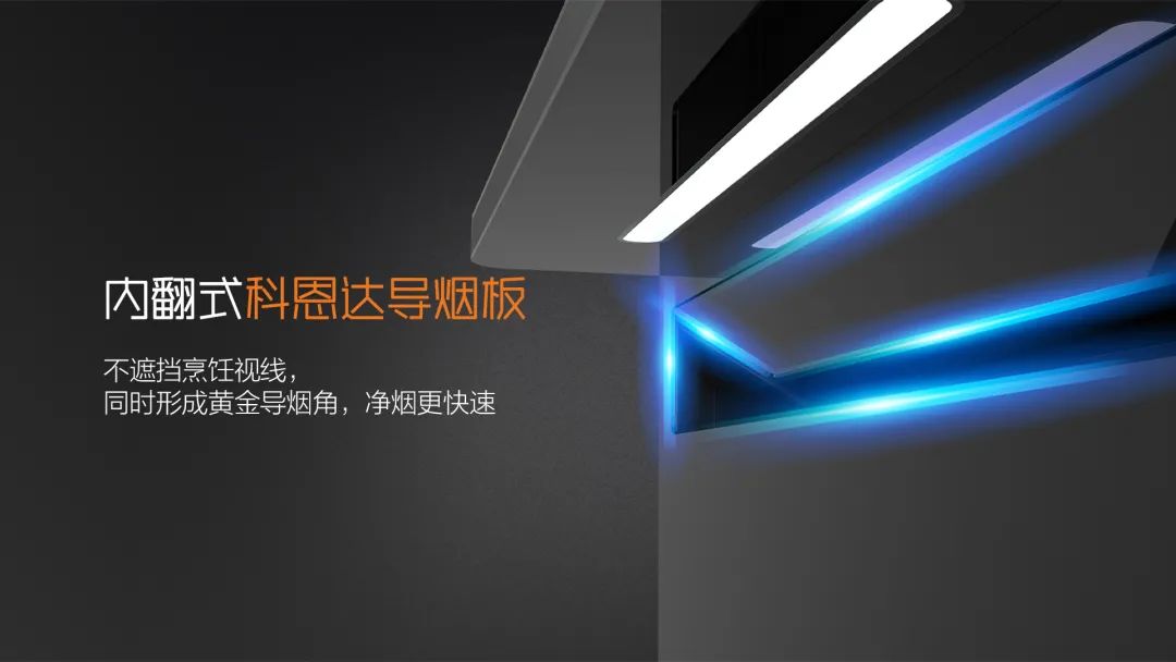 內(nèi)傾科恩達(dá)導(dǎo)煙網(wǎng)板,智能開合,獨(dú)有黃金吸煙角,不擋視線,吸煙更給力,烹飪更寬敞。