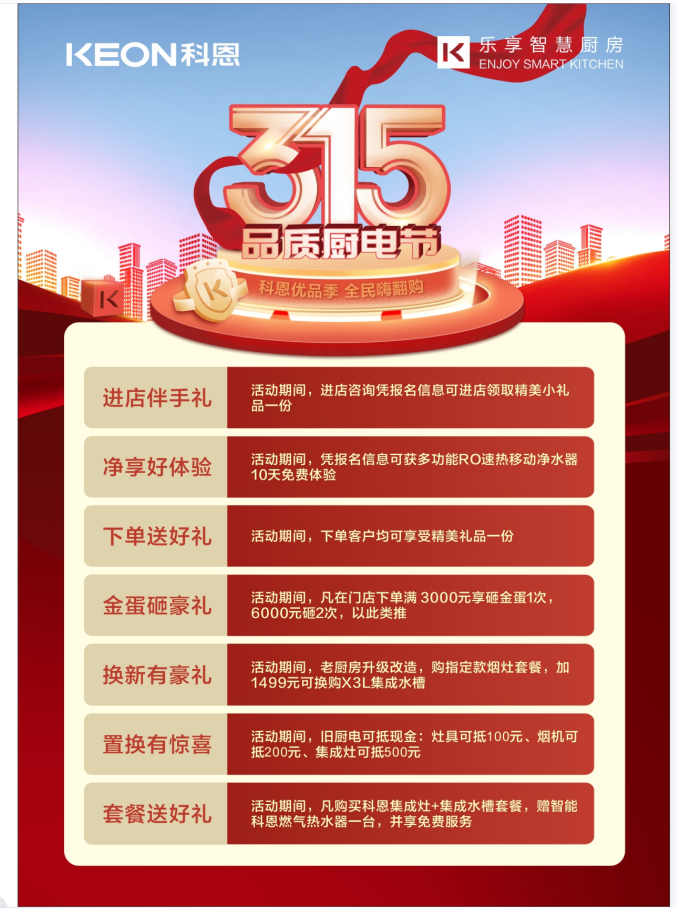 為提高消費者廚房生活質量,科恩一如既往以過硬的品質、五星的服務再次推出315特別活動。科恩全國千城萬店齊獻7重好禮,從廚房空氣到飲用水安全,從新房裝修到老廚房翻新,科恩為消費者想的更多。