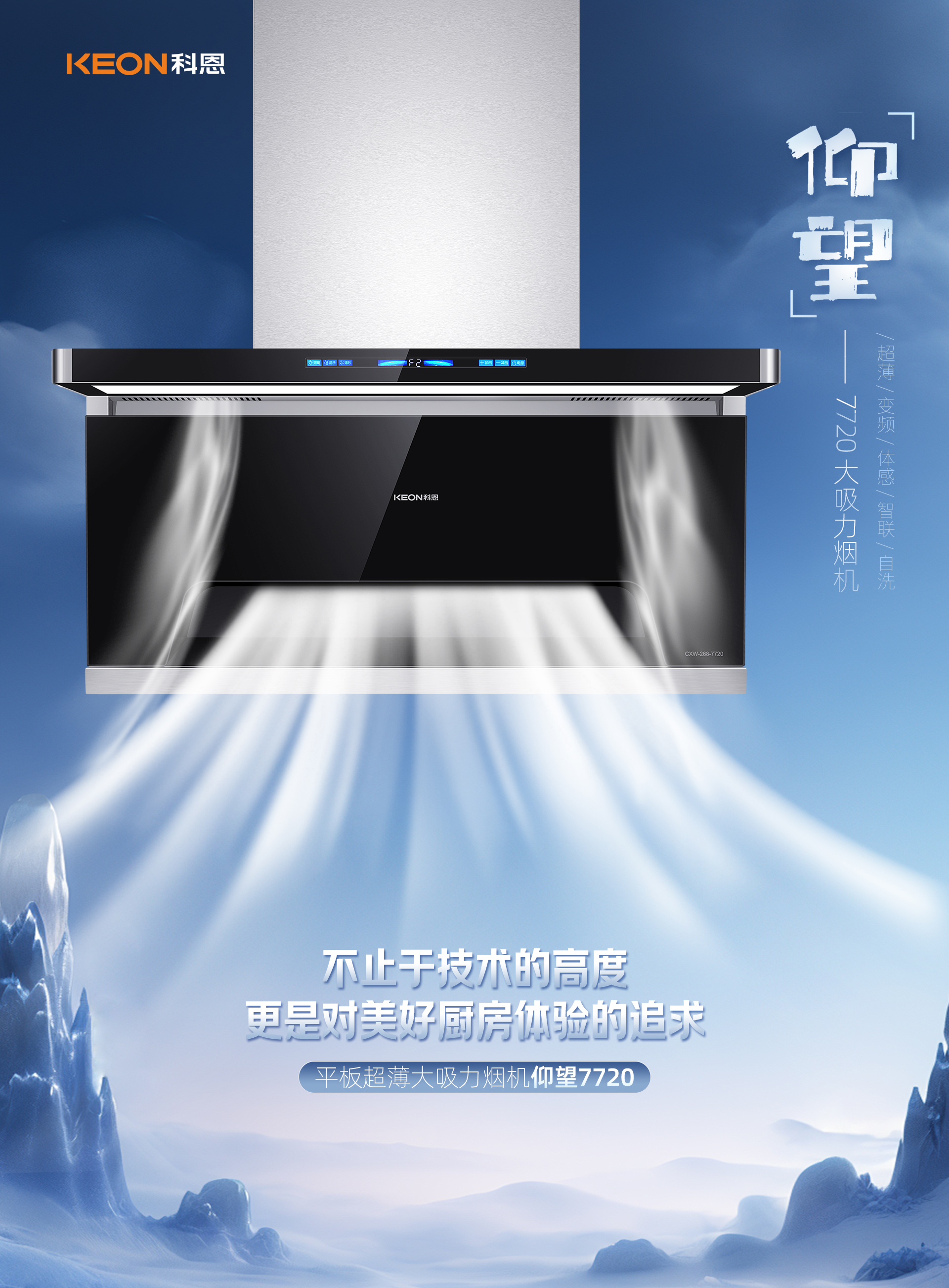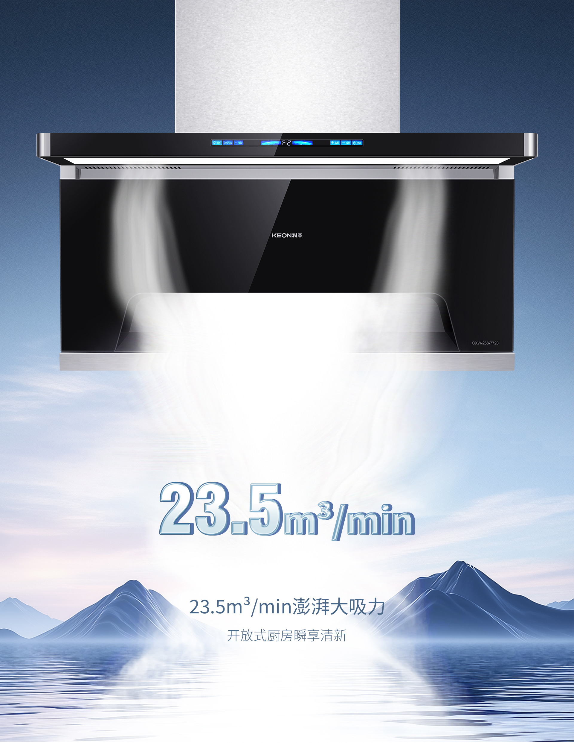 超薄顏值,靈動適配廚房美學,始于顏值895X40MM超薄靈動島設計兩邊一體拉彎,流線質感盡顯背部鉆石切割,線條硬朗大氣銀河星際觸摸屏,深邃藍光映廚藝嵌入櫥柜不突兀,獨立擺放更吸睛強吸速排,油煙無蹤爆炒油煙猛,普通煙機難應對105°上仰前傾攏煙,鎖煙于擴散之前颶風大吸力,為中國爆炒定制吸煙口負壓內傾設計,順勢直排不折返1000Pa強勁風壓,高峰時段不倒灌下層攏煙上層防逃,1+12凈煙實力