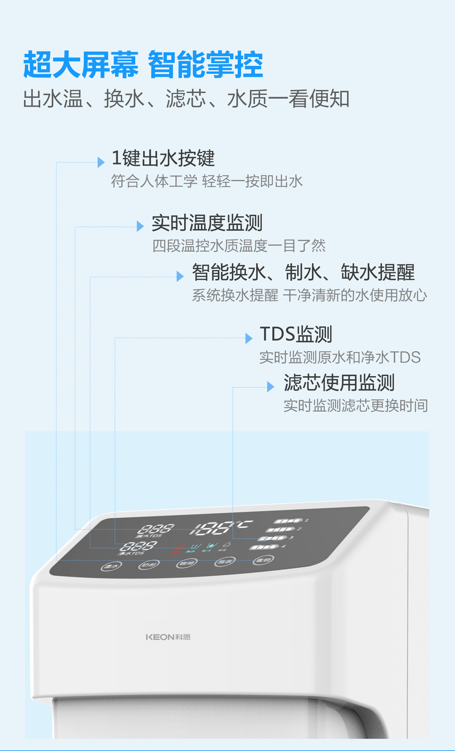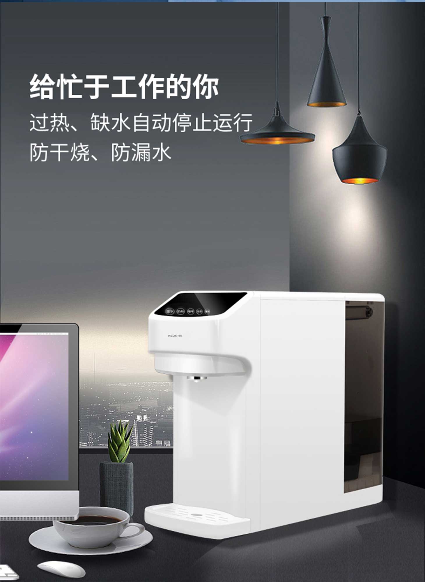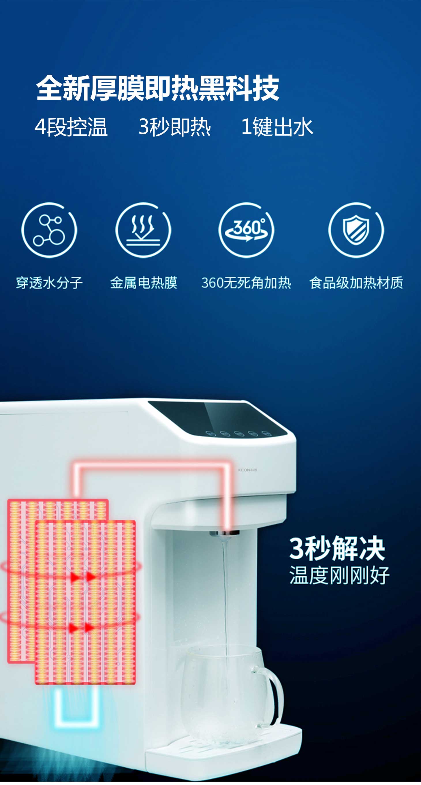 - 3秒速熱,4檔溫控(常溫、泡奶、沖咖啡、泡茶),一鍵操作,方便快捷