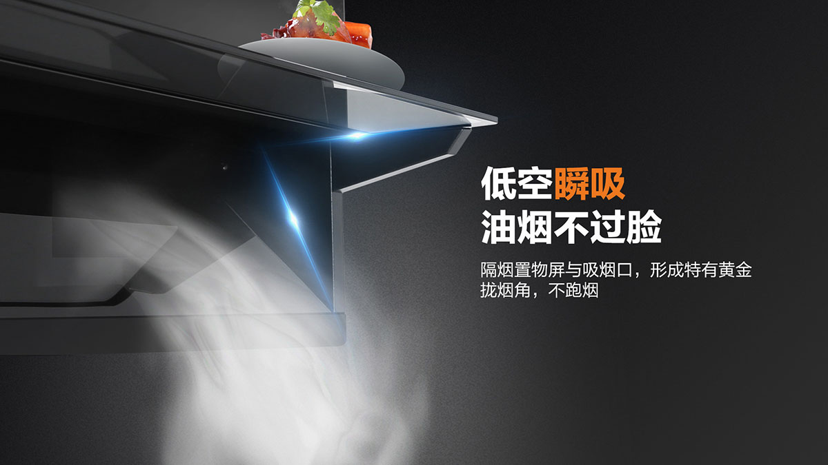 獨特黃金吸煙角,二次冷凝板內傾設計,油煙不過臉