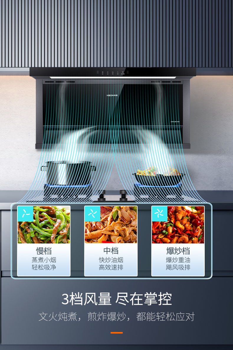 3檔風(fēng)量,盡在掌控。無論文火燉煮,煎炒小炒還是中式爆炒,都能輕松應(yīng)對。